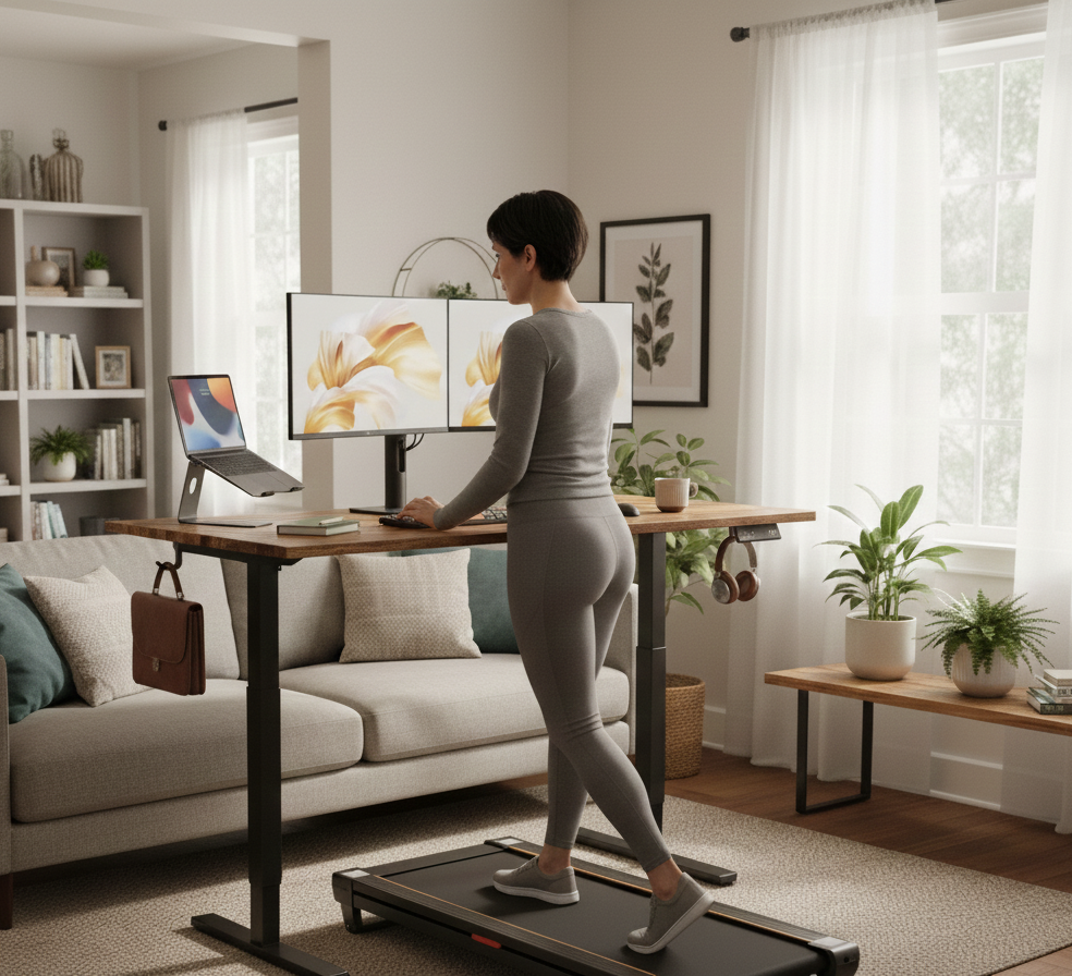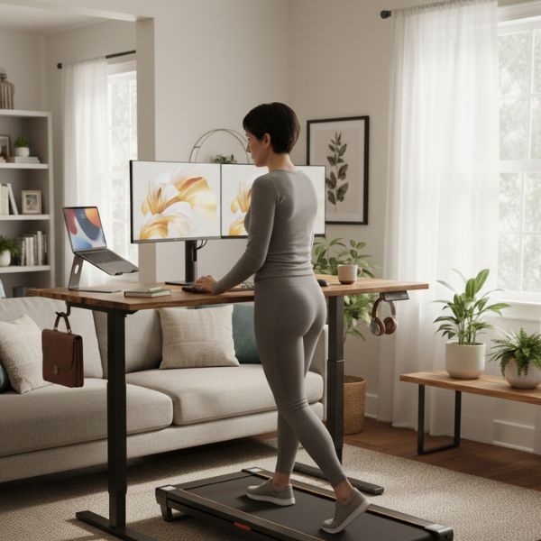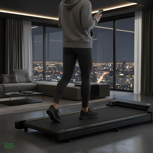 Le tapis de marche BOUGE+ propose une vitesse réglable de 1 à 6 km/h, idéale pour la marche active au quotidien, y compris sous un bureau.